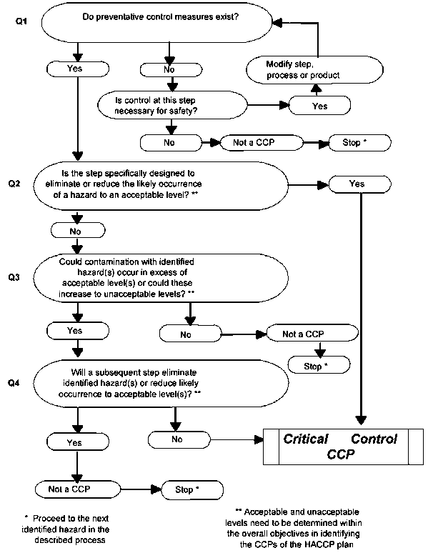 There may be more than one CCP at which control is applied to address the same hazard. The determination of a CCP in the HACCP system can be facilitated by the application of a decision tree (e.g. Diagram 2), which indicates a logic reasoning approach. Application of a decision tree should be flexible, given whether the operation is for production, slaughter, processing, storage, distribution or other. It should be used for guidance when determining CCPs. This example of a decision tree may not be applicable to all situations. Other approaches may be used. Training in the application of the decision tree is recommended.