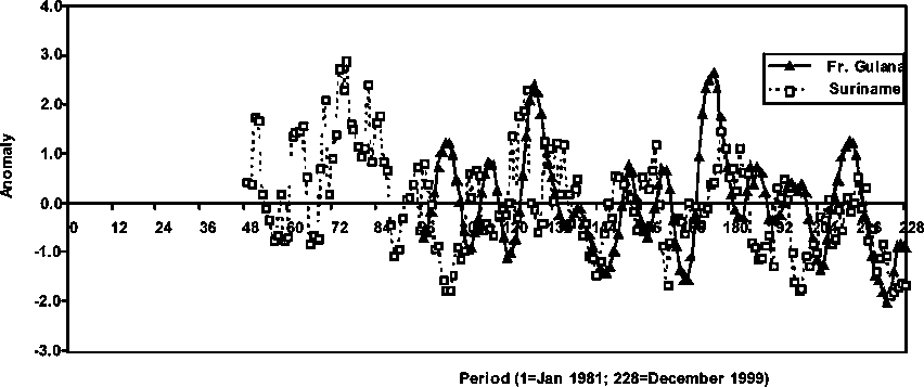Brown shrimp stock abundance in French Guiana is compared with the abundance of the species in Suriname in Figure 1 3. The seasonal abundance trends are slightly off phase - an indication of possible recruitment time differences - however, the relative (anomaly) levels of abundance appear very approximate indicating the possibility of similarities in the relative population processes occurring in that region and stocks. It is observed that the Suriname stock follows a very similar and more conspicuously decreasing trend in abundance than the one observed in French Guiana during the period 1995-1999.