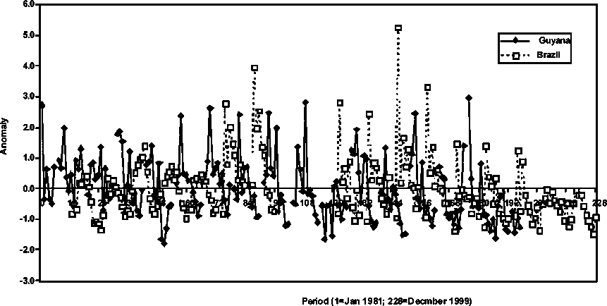 In Figures 1.12 and 1.13, the anomalies of the abundance and rainfall with no time lags are presented for Guyana and Brazil, respectively. The relative trends are indicative of the existence of fundamentally different population dynamic mechanisms acting on the Guyana and Brazil brown shrimp stocks. Therefore, the dynamics of the brown shrimp stocks in the two geographically most separated fisheries for the species cannot be simply integrated. Therefore, common conclusions cannot be drawn for management purposes.