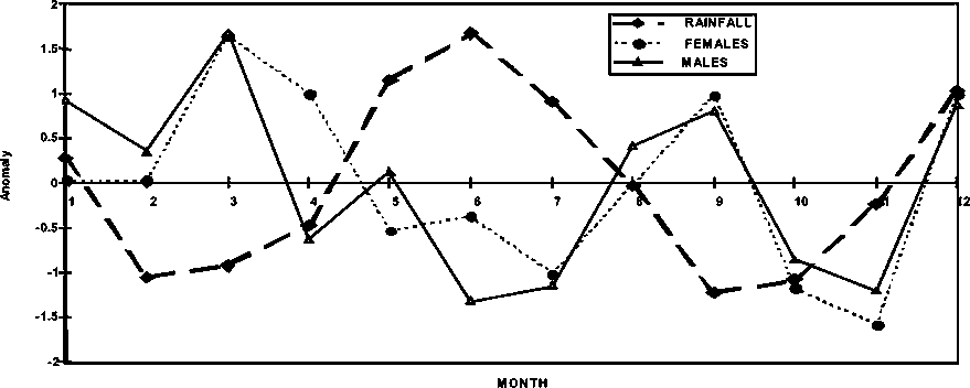 Figure 1.15 Anomalies in average abundance of P. brasiliensis in Guyana and rainfall in Georgetown