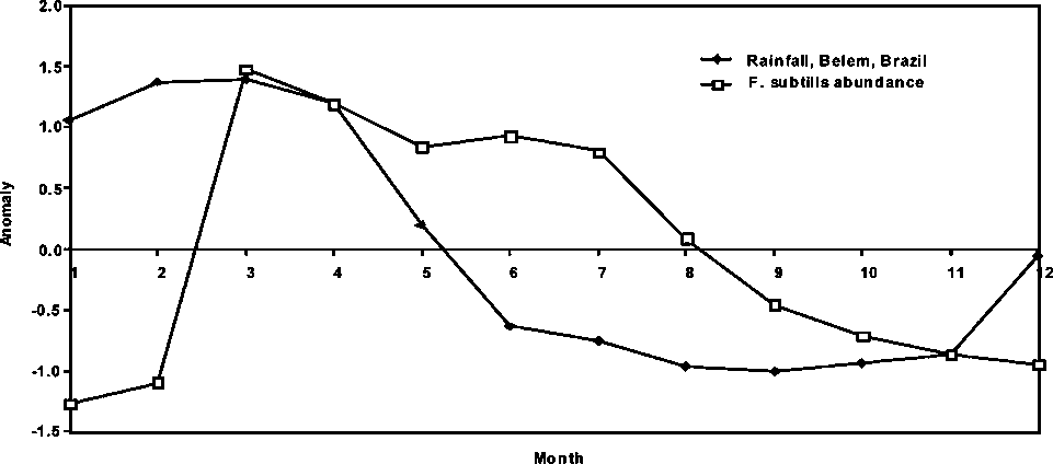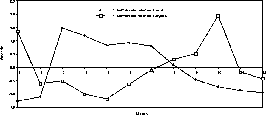 Figure 1.5 Average monthly abundance anomalies of P. subtilis in Guyana and Brazil