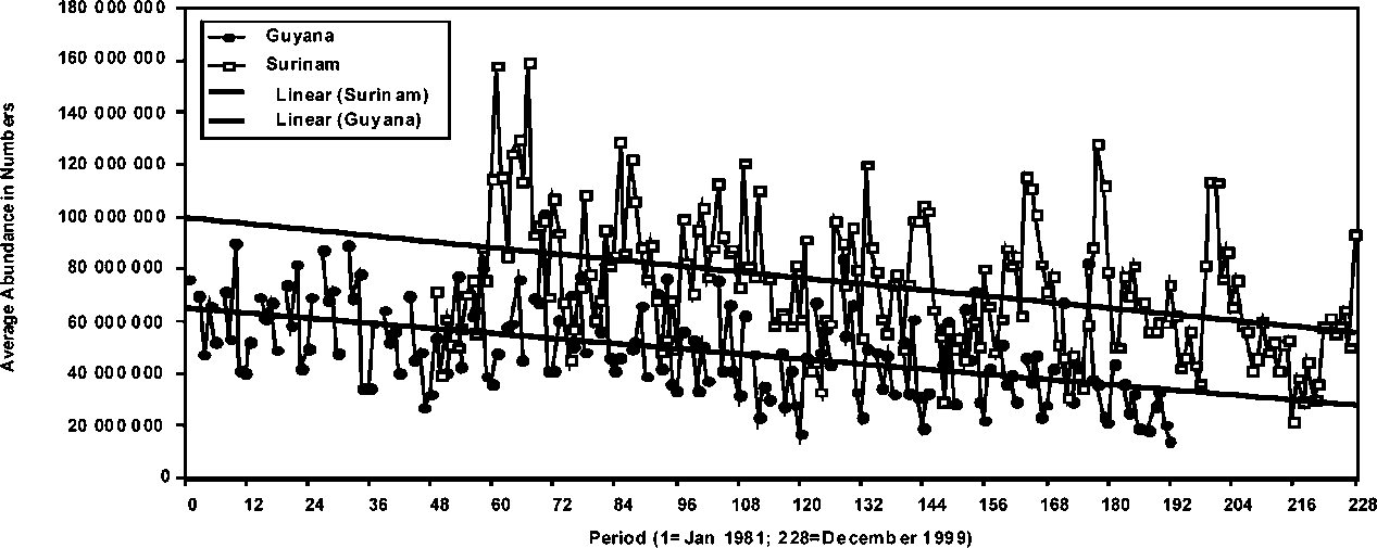 The absolute abundance expressed in number of individuals of P. brasiliensis in the Guyana and Suriname stocks is presented in Figure 1.14. The analyses of the monthly abundance trends in this figure indicate that the seasonal trends are much more conspicuous in Suriname than in Guyana. In effect, there is very little concordance between the seasonal patterns observed in the two stocks given that in Suriname the peaks of seasonal abundance are much greater than those observed in Guyana. It is also apparent that the abundance of the stocks is different, being significantly higher in Suriname than in Guyana. A striking similarity, however, is the generally decreasing trend in the abundance of the two stocks, indicating that the stocks in these two countries may be subjected to similar population dynamics processes that are impacting recruitment.