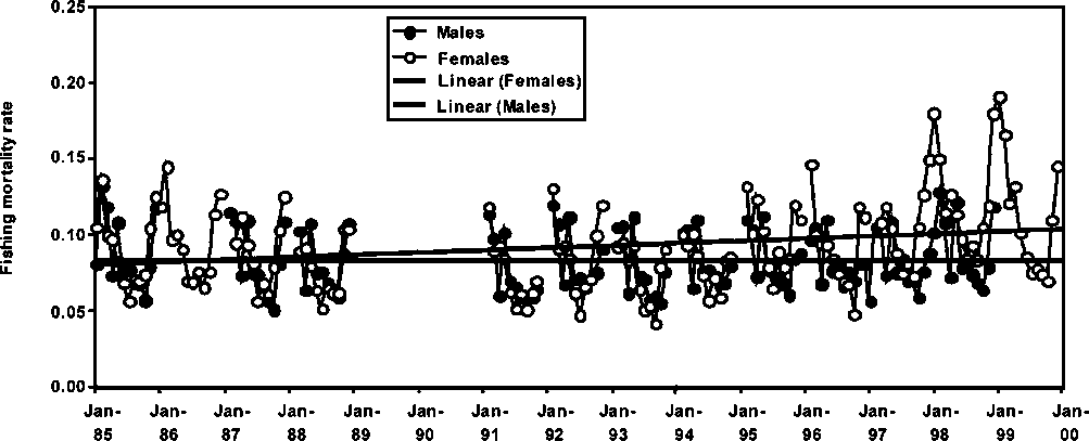 However, most of the monthly fishing mortality rates are lower than the monthly natural mortality rate of 0.18-0.20, assumed for the species in all stock assessments. It is important to note, however, that the levels of fishing mortality observed in the figures are rapidly approaching those of the natural mortality rate, therefore, this may be an indication that all stocks of P. subtilis in the region may be undergoing exploitation rates at levels close to those indicating full utilization.