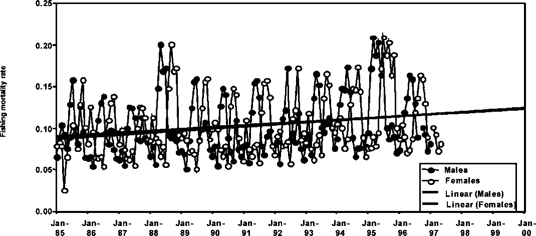 Figure 1.18 Monthly fishing mortalities of male and female P. subtilis in Suriname