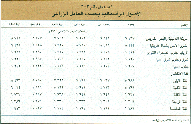 واستنادا إلى تجميع البلدان بحسب فئة انتشار نقص الأغذية، يبدو هناك تناقض واضح في كثافة رأس المال بين الفئتين الأوليين (انخفاض معدلات انتشار نقص الأغذية) والفئات الثلاث الأخرى. كما توجد فروق من حيث التغيرات بمرور الوقت: فالبلدان التي تنخفض فيها معدلات انتشار نقص الأغذية تظهر زيادة قوية (فترة الأساس 1986-1990) في الاستثمار بحسب العامل، في حين كانت التغييرات في الفئات الأخرى ضئيلة جدا بل وسالبة. وتجدر الملاحظة بأنه خلال فترة الدراسة، زادت نسبة رأس المال إلى اليد العاملة في فئة أقل معدلات الانتشار بصورة نسبية من 6 إلى 9 أمثال تلك السائدة في فئة أعلى معدلات الانتشار (الجدول رقم 3-3). ولم تبدأ البلدان الواقعة في أعلى فئات الانتشار فقط من أقل مستوى للأصول الرأسمالية في 1975، بل إن هذه البلدان على وجه الدقة، التي كانت في مسيس الحاجة إلى رأس المال لتحقيق النمو الزراعي والحد من نقص الأغذية، هي التي شهدت تناقص الأصول الرأسمالية بحسب العامل الزراعي.