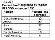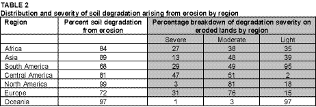 In Table 2, the degree to which erosion is the cause of land degradation by region according to the 1990 GLASOD estimates is shown, together with the distribution of the severity by three categories. These categories are somewhat anecdotal, and tied specifically to the economic costs associated with the level of degradation. For example, lightly degraded soils are those that experience only a small degree of productivity decrease and for which restoration to full productivity is possible through management modifications (Oldeman, Hakkeling and Sombroek, 1990). In contrast, moderately degraded soils have greatly reduced productivity, and require major improvements beyond the means of local farmers in developing countries for restoration to full productivity (Oldeman, Hakkeling and Sombroek, 1990)
