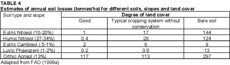 The factors represented in each of the squares of the matrix may be considered collectively as the farmer's current endowment or stock of soil natural capital. Given this initial stock of soil natural capital, farm management decisions can have an impact on the future flows of the capital; by influencing both the rate of erosion over time and the yield impacts from a given level of erosion. For example, adopting crop rotation or tillage practices that keep soils covered at times of high rainfall or wind occurrence reduces the rate of erosion. Cultivating sloping lands on a vertical rather than horizontal contour increases erosion. In Table 4, the farm management decision of how much cover to maintain on the land and its impact on the soil erosion rates for varying soil types and slopes can clearly be seen. The degree of land cover can be determined by several different management decisions including crop choice (e.g. perennials versus annual), crop sequencing/rotations, or tillage practice (e.g. conservation tillage versus conventional tillage).