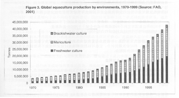 水产养殖的产量由1980年的7.4百万公吨增长至1990年的16.8和1999年的超过42百万公吨(图-1),价值凌驾530亿美元。这行业的产量每年是以超过百分之十的速度在增长,与其相比,陆上家畜年产量增长率只有百分之三而渔获量的增长每年只是百分之1.5。自1984年以来,水产养殖对世界食用鱼类上市量(landings)的贡献已超过双倍。在1997年里,人均食用鱼供应量(percaputfood fish supply)是16.l公斤(kg),而其中有百分之30就来自水产养殖。全球性的预测水产养殖的未来供应量,至2010年可达47百万公吨(Pedini and Shehadeh,1997)。