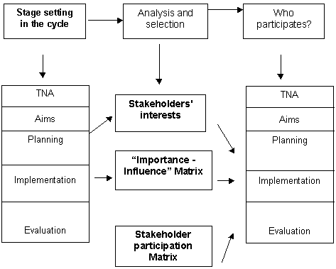 The initial basis for the choice of who should participate in curriculum development is to identify objectives of curriculum development, and the roles and responsibilities of various stakeholders at different stages in the cycle. Based on these objectives and roles, a list of stakeholders participating in curriculum development can be made. Analysis and choice of stakeholders are often based on the interest and potential roles and functions of each stakeholder, as well as the degree of influence which stakeholders may have on curriculum development. The process of stakeholder analysis has been adapted from a tool used quite commonly in the development of community development projects and programmes.