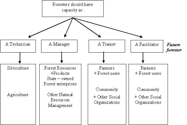 The TNA in 1996 was an attempt to understand the roles and responsibilities of future foresters in Vietnam. It began with an analysis of the responsibilities of current foresters, and what they would be in the future. The results of the TNA revealed the nature of the "old model forester" was to carry out basic functions of technical forestry instruction and forest resource management, mainly for State-owned forestry enterprises. Identifying the knowledge, skills and attitudes required by the "forester of the future" was more difficult because of the dynamic context of the forestry sector. It was, to a large extent, an exercise in "fortune-telling". Nevertheless, through a series of analyses and workshops, a model for the future forester was developed. A field forester should be, at the same time, a technician, a manager, a trainer and a facilitator of agricultural, forestry and rural development activities.