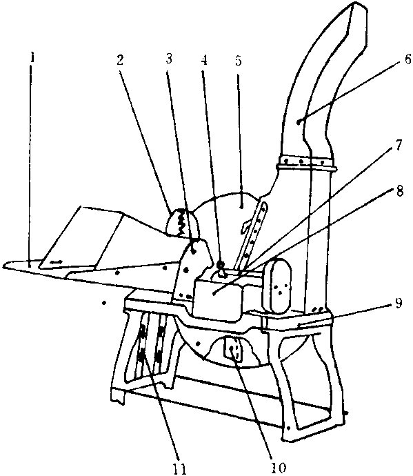 KEY: 1. Feed channel; 2. Bow shape frame; 3. Supporting frame for rollers; 4. Handle for changing position; 5. Cover; 6. Outlet for straw; 7. Connecting shaft; 8. Gearbox; 9. Chassis; 10. Movable blade; 11. Motor frame.