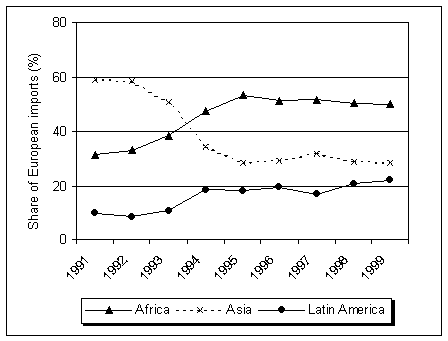 Regional sources of supply have changed over recent years, influenced by a number of factors including the imposition of logging bans by producer countries wishing to encourage the development of a local processing industry. Over the decade, logs have been imported almost exclusively from Africa. With sawnwood, there was a marked decline in the import share from Southeast Asia in the period to 1995 and a growth in the African and South American shares (see Figure 2.2). This has naturally altered the species mix of imported timbers. Asian countries, notably Indonesia, are the main plywood suppliers. Latin America (particularly Brazil) has a well-developed plywood industry and exports to Europe. A small amount of plywood is imported from Africa but the industry is generally less well developed in this region (see Figure 2.3).