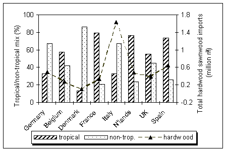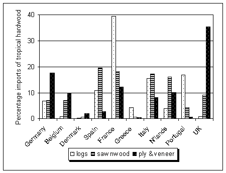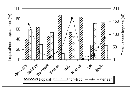 Sources of supply of tropical logs, veneer and plywood also vary slightly between European countries, but differences are most noticeable in sawnwood supplies (see Table 2.2). These, to some extent, represent old trading traditions, patterns of use of tropical timbers and species preferences. African timbers held the largest import share in Germany, Spain and Italy; Southeast Asia leads in Belgium, the Netherlands and the United Kingdom and South American timbers in France and Portugal.