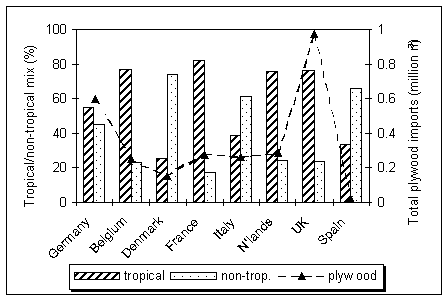 Table 2.5 shows the production of tropical plywood in a number of European countries in 1993 and again in 1999. As may be observed, in 1993, France accounted for over 55 percent of the tropical plywood produced by all of these countries. Greece, Portugal and Spain accounted for the bulk of the remainder of production. In 1999, the picture was very similar, with France now accounting for over 60 percent of tropical plywood production. Germany and Spain accounted for much of the remainder.