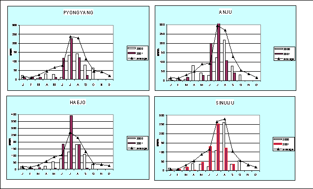 In 2000/01, rainfall started slowly nation-wide and performed very poorly throughout spring, with monthly rainfall all over the country much below the long term average. The drought continued until mid-June. However, as reported by almost all recording meteorological stations, cumulative precipitation between mid-June and September has performed better compared to the very poor performance during the previous cropping season. In most places, rainfall performed at the level of or above the long term average. In South Hwanghae, South Pyongan and Kaesong, the good rains since mid-June were followed by heavy precipitation from July through mid-August, but, then, were interrupted till end of September. The severe spring drought which had resulted in a dramatic yield reduction of the winter and spring 2000/01 double crop, also affected the 2001 maize crop at the early stages of crop growth and resulted in successive plantings. Non-availability of quality seeds constrained further yield improvement. Insufficient rains and low supplies of irrigation water also caused delay in paddy transplanting in many places and a consequential slight decrease of overall planted area. However, it only marginally affected the paddy yields, except in some areas which have suffered from severe water shortages or have not been able for different reasons to pump irrigation water. Figure 1 shows the 2001 rainfall data compared with those of the previous seasons and with the long term average from four representative stations located in the major producing areas of DPR Korea.