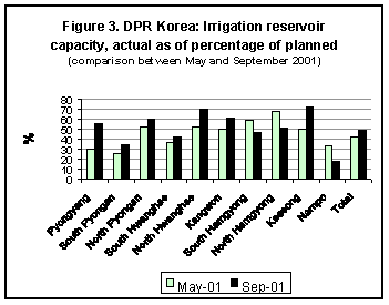 The irrigation pattern in DPR Korea is dependent on the availability of water in the reservoirs and rivers. Due to this year's adverse spring weather which followed last year's drought, water levels in all reservoirs remained low until June (at about 40 percent of the capacity) and did not permit irrigation of the maize crop during the plant establishment period. However, abundant and well distributed rains from mid-June through August replenished most irrigation reservoirs. In September 2001, the water levels in ten major stations were reported to be, on average, about half the reservoir capacity (Figure 3).
