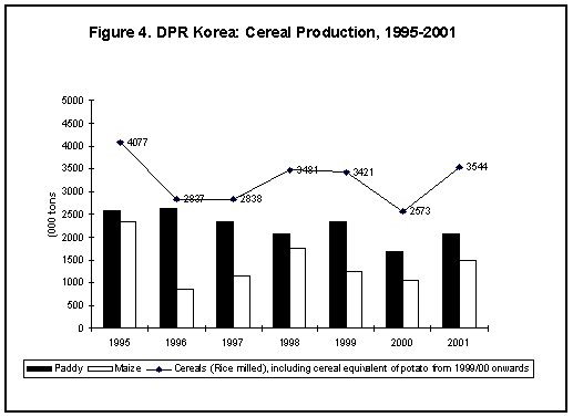 The industrial sector is in a precarious state, with obsolete machinery and suffering from critical shortages of spare parts and raw materials, while the agricultural sector is plagued by shortages of inputs compounded by adverse weather conditions. Following an improvement in 1998/99 (although still below 1995/96 production) after a continuous decline over the previous several years, cereal production dipped sharply in 2000, generating a massive food gap (import requirement) of over 2 million tonnes. Estimates show that there has been a recovery in 2001 to about the 1998/99 level; the severe 2001 spring drought has been a cause preventing a better harvest. In fact, the government and the cooperative/state farms mounted extraordinary efforts this year to improve food production. The government budget for the agricultural sector, reportedly increased this year by 10 percent compared to last year, translated in increased supplies of agricultural inputs in a timely manner. Substantial international assistance with the supply of fertilizers was provided. These factors obviously have been helpful in substantially circumventing the adverse impacts of the spring drought and resulting in a significant recovery in cereal production in 2001.