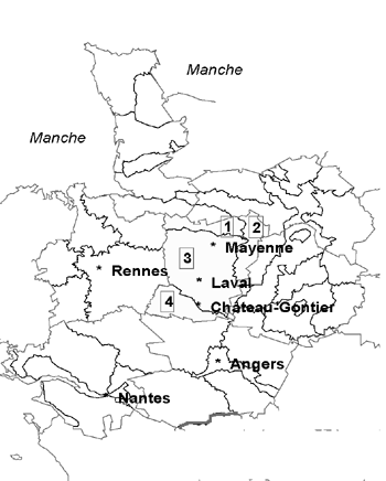 Les régions forestières: basses collines de Normandie (1), Avaloirs-Coëvrons (2), Bas-Maine (3), bocage angevin (4).