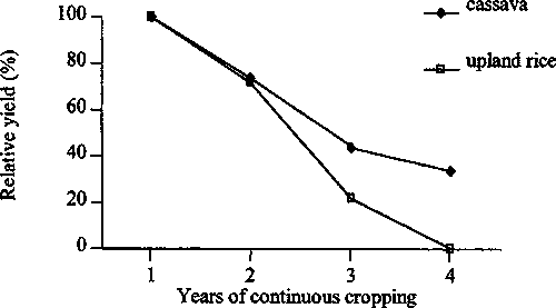 Figure 2. Yield reduction of upland rice and cassava due to fertility decline as a result of continuous cropping without fertilizer application. 100% corresponds to 18.9 t/ha of fresh cassava roots and 2.55 t/ha of rice.