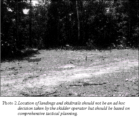 Another procedure that was observed on the study area to have a significant negative impact on the residual stand is the fact the skidder operator often followed a different route to the landing than the one followed to reach the felled tree. This practice results in substantially more soil disturbance and damage to residual vegetation than if designated skidtrails were used. In addition, the skidder operator sometimes searched for felled trees by driving the skidder through the forest, rather than by walking. In the aggregate, these unplanned searching and skidding activities contributed to a dense criss-crossing network of skidtrails, some of which even led to natural canopy gaps in which no tree was felled.