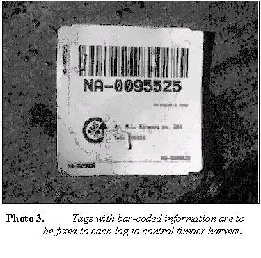 According to a recently introduced system, licensees are required to keep logging registers and fix tags with bar-coded information to each log (Photo 3). Corresponding tags are also to be attached to tree stumps so that each log's origin can be traced if necessary (personal communication with SBB). Log movement by truck is monitored by SBB/LBB during scaling, which occurs during the transit of logs from the forest to the sawmill (Eckelmann 1999).