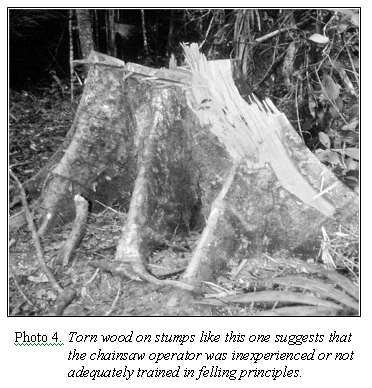The intended felling direction of each tree is decided by the chainsaw operator based on his judgement of how the tree can be felled safely without becoming hung up in the crowns of neighbouring trees. However, misjudgement and poor understanding of felling principles frequently result in unnecessary breakage (Photo 4), damage to residual trees, and personal danger to the felling crew. On this study, a poorly maintained chainsaw frequently broke down at critical points during felling.