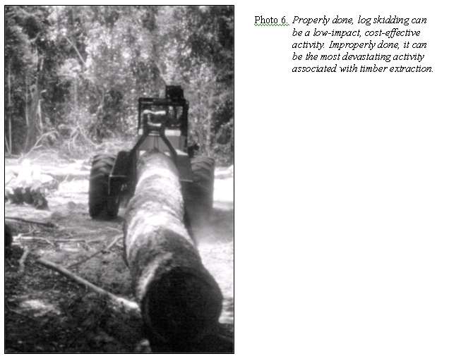 In the conventional logging system, the skidder operator drives to each felled tree. The winch line is then wrapped directly around the log to be skidded. To enable the skidding assistant to push the winch line under the log, the skidder operator often uses the skidder's blade to raise the log by pushing it against nearby trees. As a consequence, the neighbouring trees are often bent or broken, or their bark is stripped off. In some cases, more than one log may be skidded at a time. To accomplish this, the logs are manoeuvred into alignment by the skidder, an activity that may cause extensive soil disturbance and damage to residual vegetation in the vicinity of the felled tree. This could be avoided by attaching a choker cable to each log and then gathering the choker cables with the winch line, a technique that is commonly used in industrialized countries.