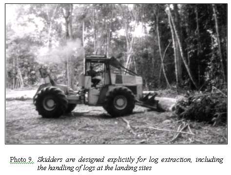 The skidding operation is normally planned to begin several days after completion of felling operations. However, due to the time constraints in carrying out this study, extraction of logs started immediately after the felling crew had left sample unit Plot/01 to commence felling on Plot/02. Starting from the existing forest road, the skidder operator opened a short road up to 8 m in width to provide access to the harvest area. Clearing vegetation and moving soil was done by means of the skidder's blade. At the end of this short access road, a landing was established on both sides of the road to serve as a collection point for logs extracted from the sample units.