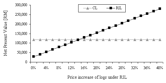 The effect of changes in RIL harvesting costs is illustrated in Figure 6. Leaving other factors unchanged, a reduction of more than 30% in harvesting costs is required to make the RIL system more profitable than the CL system.
