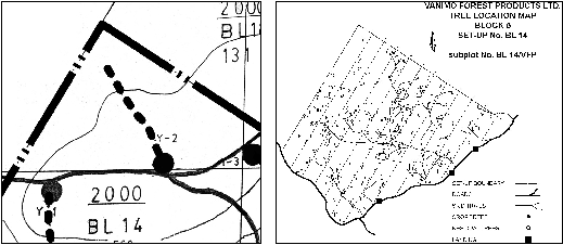 The complete skidtrail system in Subplot BL14/VFP was mapped after timber extraction had been completed. Only primary skidtrails are included in the pre-harvest plan (Figure 8a) but the assessment included secondary skidtrails as well (Figure 8b). The width of the skidtrail and degree of soil disturbance were recorded at significant points along each skidtrail.