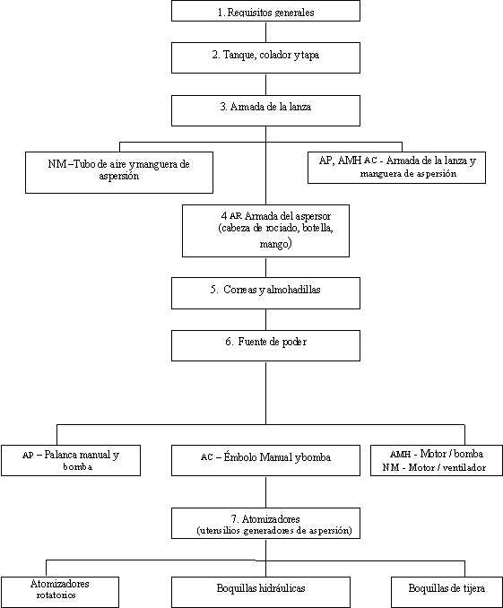 del 75% del volumen total del tanque. 2.16. Con el aspersor debe suministrarse un embudo con un colador integral, para filtrar el agua o la solución que se va a aplicar a medida que entre en el tanque. 2.17. El embudo con colador debería tener una apertura de malla de un tamaño no mayor de 1.0 mm. 2.18. La malla del embudo con colador debería estar ajustada en forma segura, o formar parte del cuerpo del embudo. 2.19. El embudo debería permitir un llenado seguro y fácil desde un recipiente sin perfil (es decir, un 1.1 sin labio o pico) a una tasa de 10 litros por minuto, sin derramar o salpicar. 2.20. La boca de llenado del tanque debería sellarse con una tapa que se pueda abrir o cerrar en forma segura sin herramientas y con las manos enguantadas. 2.21. Al tanque se le debería acoplar un instrumento indicador de presión. 2.22. Al tanque se le debería acoplar una válvula de seguridad y de liberación de presión para prevenir que la presión en el tanque no exceda de 6 bares. 2.23. Al tanque se le debería acoplar una válvula liberadora de presión que opere fácilmente con las manos enguantadas. 2.24. Después de la aspersión no debería ser posible quitar la tapa (o la bomba) antes de que se libere la presión residual. 2.25. Los ajustes tejidos de las partes presurizadas del tanque que tengan un diámetro mayor de 13 deberían incluir un canal que asegure que la presión en el tanque se libere antes de que se quite la tapa (o la bomba). 3 Módulo 3 – ARMADA DE LA LANZA Y LA MANGUERA DE ASPERSIÓN(Para AP, AMH, AC). TUBO DE AIRE Y MANGUERA DE ASPERSIÓN (para NM) 3.1 Cuando a las mangueras de aspersión se les dobla hasta 180 grados a temperaturas hasta de 30°C, no deberían aplanarse. 3.2 Las conexiones de la manguera deberían ser fácilmente ajustables y removibles con las manos enguantadas y no deberían filtrarse cuando se les reconecte. 3.3 Las mangueras de aspersión deberían tener una longitud suficiente para permitir libre movimiento y ubicar adecuadamente la lanza para asperjar. 3.4 La longitud mínima de la lanza desde el frente de la agarradera de gatillo del mango hasta la boquilla debería ser de 500 mm. Para NM la longitud del tubo del aire desde la palanca prenda / apague (on / off) hasta la salida del aire debería ser no menor de 400 mm. 3.5 El aspersor debería tener incorporado un robusto “sistema de estacionamiento” para asegurar la lanza o el tubo del aire cuando no se estén usando. 3.6 La lanza debe tener acoplada una válvula de gatillo prenda / apague (on / off), la cual pueda asegurarse en la posición apague (off). Para el NM la línea del suministro de líquido hasta la boquilla debería tener incorporado una válvula prenda / apague (on / off). 3.7 La longitud de una palanca de válvula gatillo medida desde el punto del pivote no debería ser menor de 100 mm. 3.8 La armada de la lanza (AP, AMH, AC) debería incluir un filtro removible con un tamaño de apertura de malla que no exceda de 0.3 mm., que sea fácil de instalar y de quitar con las manos enguantadas. 3.9 El filtro removible en la armada de la lanza (ver sección 3.8) debería estar localizado contra la corriente de la válvula gatillo. 3.10 Las boquillas intercambiables pero no ajustables (AP, AMH, AC) o los restrictivos (NM) deberían ser suministradas con el aspersor. 3.11 La presión mínima de operación en la boquilla no debería exceder de 4 bares (AP, AMH, AC). 3.12 Cuando se incluye un indicador de presión, este debería estar en sentido contrario a la corriente en la válvula prenda / apague (on / off). 4. Módulo 4 – ARMADA DEL ASPERSOR para AR (cabeza de rociado, botella, mango).4.1 En todas las posiciones de trabajo recomendadas, la cabeza de rociado debe estar a un mínimo de 500 mm. de todas las partes del cuerpo del operario para asegurar que no haya contaminación directa de esta persona con las gotas de la aspersión. 4.2 Para controlar la tasa de flujo del líquido rociado, el aspersor debe ser suministrado con restrictivos intercambiables con código de color que puedan cambiarse sin herramientas especiales (es decir, sin herramientas diseñadas específicamente para el aspersor). 4.3 Con el aspersor también debería suministrarse un escudo para proteger al atomizador de daño físico cuando no esté en uso. 4.4 Cuando el líquido de aspersión para el atomizador se suministre solamente desde una botella ubicada en la cabeza del aspersor (es decir, no se rellena desde el tanque del aspersor) debería suministrarse un embudo con el aparato. 4.5 El embudo debería permitir que la botella se llene fácilmente desde un recipiente sin perfil (es decir, un sin un labio o pico, el cual sería, por lo general, un recipiente de pesticida) sin derramarse o salpicar, a una tasa de 5 litros por minuto. 5 Módulo 5 – CORREAS Y ALMOHADILLASPara AP, AMH, AC, NM, AR 5.1. Las correas y los ajustes deben ser fuertes y durables. 5.2. El fabricante debería dar una declaración escrita en el manual de los aspersores en la que: las correas y almohadillas estén hechas con material no absorbente y que resistan el deterioro indebido del contacto con formulaciones de plaguicidas aprobadas. 5.3. Un aspersor AP debería estar equipado con un cinturón para cargarlo. 5.4. La parte que soporta la carga en las hombreras de las bandas debe tener un mínimo de 50 mm. de ancho. 5.5. Cuando se incluyen hombreras ajustables, ellas deberían permanecer en el sitio de su posición de ajuste cuando se esté usando el aspersor. 5.6. Cuando las correas estén acopladas al tanque de mochila (AP, AMH, NM, AR) ellas deberían ser fácilmente ajustables, cuando el aspersor esté lleno en la posición de trabajo sobre la espalda del operario. 5.7. Las correas deberían estar acopladas con hebillas de fácil liberación que funcionen eficientemente, cuando el tanque (AP, AMH, NM, AR) esté lleno en la posición de trabajo sobre la espalda del operario. 5.8. Los tanques cargados en la espalda cuan