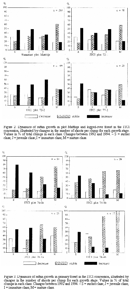 In two plots (72-1, 72-2) the rattan population increased considerably (22% and 30 %, see Table 5.8), in the third plot (77-2) the population was rather stable.