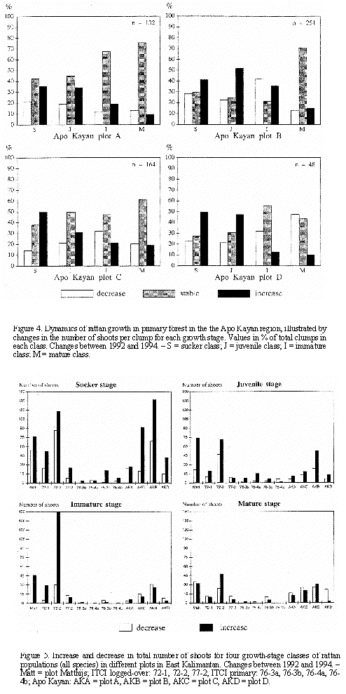In plot 76-4a, there is a relatively high increase in the number of juvenile shoots and 60 % of the plants of the juvenile class show an increase in shoot number. This is primarily caused by recruitment. The number of mature canes, however, showed a considerable decline. Pigs that frequent the site, ploughing the soil and eating rattan shoots, probably cause these changes.