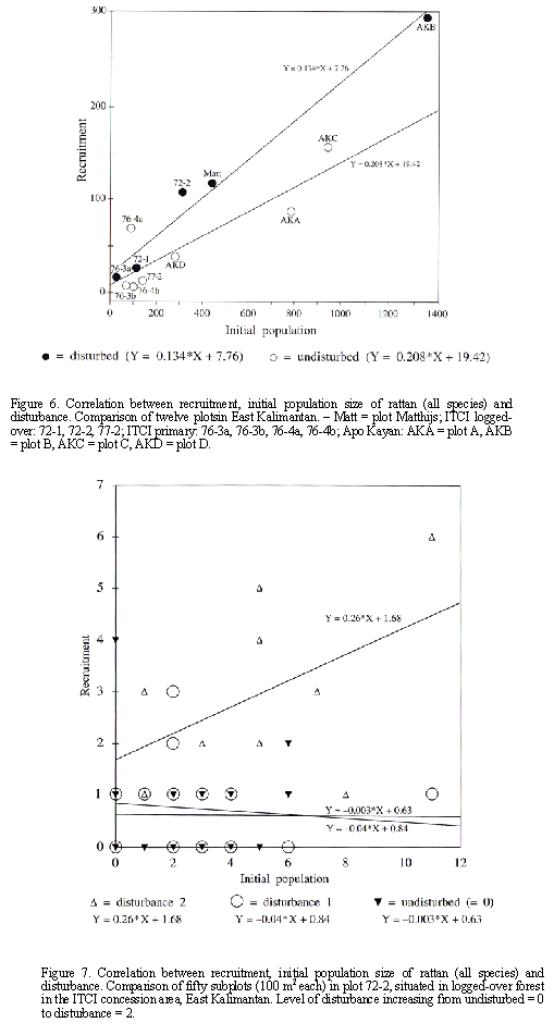 In order to judge the significance of disturbance on the recruitment of rattan, the twelve plots were compared using a procedure fit-curve (Genstat 5, 1990). Each plot was classified as either disturbed or undisturbed depending on the presence of degrading canopy trees, a chablis, or serious effects of drought. Furthermore plot 72-2 was studied in detail, whereby all 50 subplots were tallied according to the degree of disturbance (three classes distinguished: 0, 1 and 2, with disturbance increasing from 0 to 2).