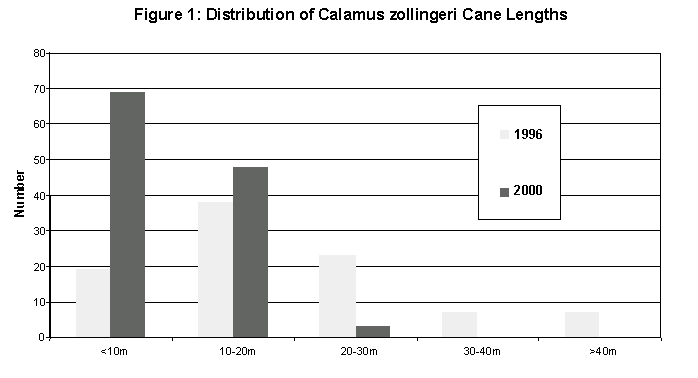 On marked C. zollingeri plants we found that the mean number of ramets/genet was significantly greater in 2000 than in 1996 (Table 3). However, the mean number of harvestable ramets/genet (i.e., canes > 10 m length) was significantly lower in 2000 than in 1996, as was the mean length of harvestable cane and the total amount (i.e., length) of harvestable cane. In fact, in 2000 there was less than half the amount of harvestable cane as recorded on the same plants in 1996. The impact of intensive cane harvesting is readily apparent when comparing cane length distribution classes in 1996 with 2000 (Figure 1). For example, we recorded 37 canes greater than 20 m in length on marked C. zollingeri in 1996, but only three canes greater than 20 m on the same plants four years later.