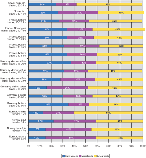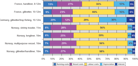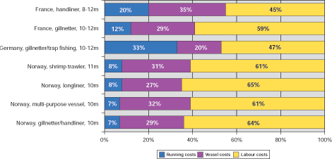 As shown in figure 7 below and as it has also been the case in the European deep sea trawl fisheries, labour costs - amounting from 45 to 64% - account for the major share of operating costs in the European small-scale fisheries studied i.e. in Norway, Germany and France. Vessel costs are the second highest cost component ranging from 20 to 35%. Running costs ranging from 7% to 20%, except for German coastal vessels, play a minor role mainly caused by lower fuel expenses. The importance of labour costs compared to vessel costs and running costs, is even higher than in deep-sea trawl fisheries.