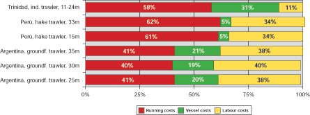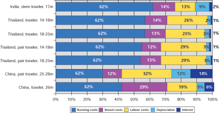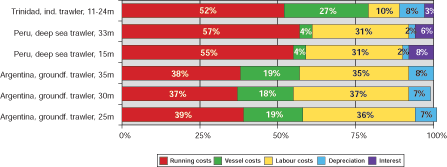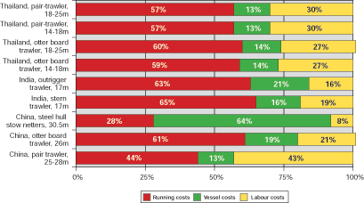 The same trend as in the case of Trinidad and Tobago, Argentina and Peru can be observed regarding trawlers in the developing countries studied in South, South East and East Asia i.e. India, Thailand and the Peoples Republic of China. Figure 3 below shows that with the exception of two types of Chinese vessels, labour costs only amount to somewhere between 16% and 30% of the operating costs of deep-sea trawlers while running costs are the most important cost component and among the running costs, the cost of fuel is highest. Generally, vessel costs are of minor importance, in most cases accounting for less than 20%.