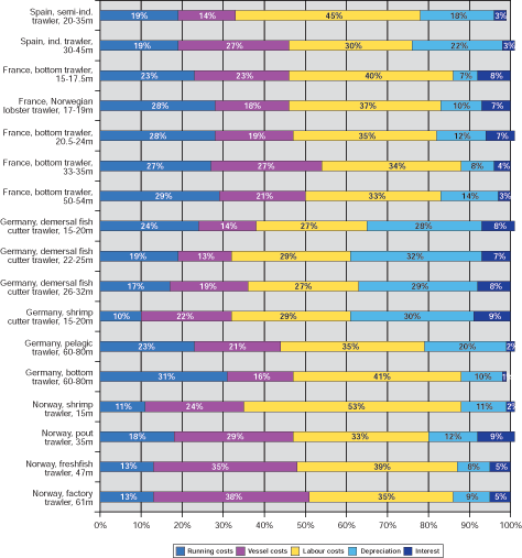 Among the more outstanding findings were that in the case of trawl fisheries, there are significant differences in the cost structure between developed and developing countries, which are related to the higher cost of labour in the former countries. In the trawl fisheries of developed countries, labour costs were the most important element followed by running costs and vessel costs while in developing countries, labour costs were less important and running costs were the most important cost element. For the same reason i.e. higher labour costs, the operating costs per unit of gross earnings were higher for trawlers in developing countries than for trawlers in developed countries.