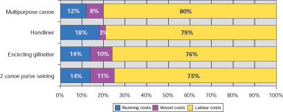 When looking at the cost structure of small-scale fishing vessels in South and Southeast Asia, labour costs are the most important component of the costs of operation of four of the six types of vessels shown in figure 13 below. The situation is thus similar to small-scale fishing vessels in Europe and in Senegal. In the case of the Indian log raft operating trammel nets and of the Thai push netter, running costs exceed labour costs. As in the case of the most Caribbean and Senegalese vessels and different from European small-scale fishing vessels, running costs rank second and vessel costs rank third.