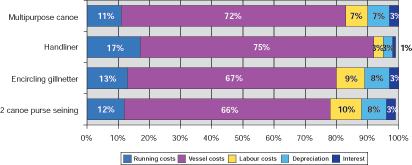 When taking into consideration the costs of operation, which lead to the gross cash flow, vessel costs only include expenses for repair, maintenance, etc., but no costs of investment (depreciation and interest), which are closely related to the value of the vessel active in a particular fishery. If these cost components, which are only calculated and not part of the actual cash flow are also considered, a different picture is shown in some cases with regard to the ranking of cost components as shown in figure 4 below.
