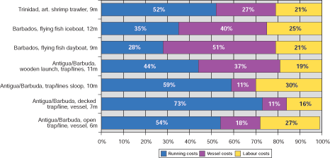 In the case of small-scale fishing vessels in the Caribbean, a different picture from the one in Senegal emerges. Figure 11 below shows that only in the case of the two types of Barbados flying fish fishing boats using gillnets, dip nets, handlines and fish aggregating devices, do labour costs rank as highest cost component, followed by running costs and vessel costs. In all other cases i.e. four types of boats fishing for lobster and high value bottom species in Antigua and Barbuda and artisanal shrimp trawlers in Trinidad, running costs are the most important cost component as it was already the case with deep sea trawlers operating in developing countries.