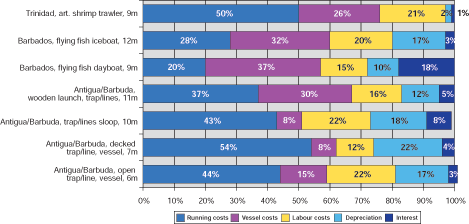 Taking into account the cost of depreciation and interest, the cost structure of small-scale fishing vessels in the Caribbean resembles more the situation found in Europe than the one in Senegal. The vessel costs combined with depreciation and interest range between 24% and 48%, which is close to the situation found in Europe and indicates only a slightly lower level of capital investment. In the case of the two types of boats catching flying fish in Barbados and the sloop catching lobsters and bottom fish in Antigua and Barbuda, vessel costs together with depreciation and interest even account for the highest share of total expenses.