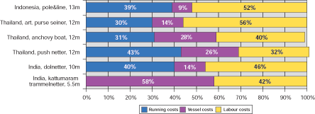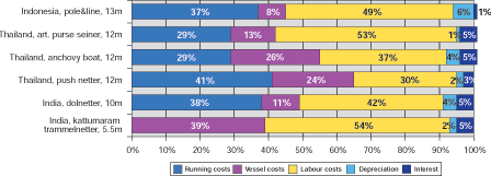 In three of the six cases i.e. the Thai push netters and anchovy boats and the Indian kattumaram do vessel costs together with depreciation and interest rank second while in the other three cases they are the least important cost components. This again indicates a relatively low level of capital investment.