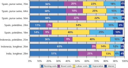 In the case of the Indian and Indonesian longline vessels covered by the study, running costs and particularly the cost of fuel are by far the most important cost component in longline fishing. As can be seen from the cost structure of the Indian and Indonesian longliners, running costs account for 51% and 65% respectively of the total costs, including the cost of depreciation and interest of these types of fishing vessels. In the case of the Indian and Indonesian longline vessels, running costs are even higher than vessel costs and the costs of depreciation and interest combined. The share of labour costs of the total costs of tuna longlining is very similar in India and Indonesia and labour costs only account for 13% and 14% respectively of the total costs.