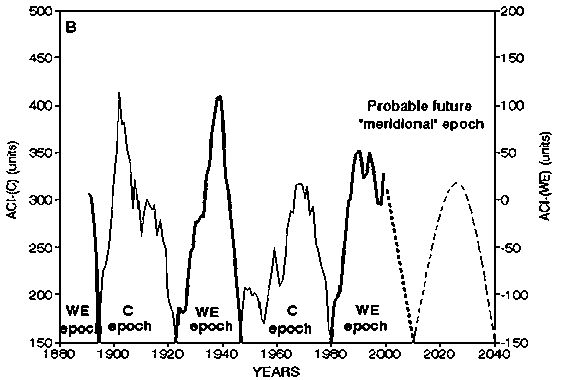 Figure 3.6 Dynamics of "meridional" (C) and "zonal" (WE) forms of the Atmospheric Circulation Index (A), and alternation of "meridional" and " zonal" circulation epochs (B) (see the text for details).