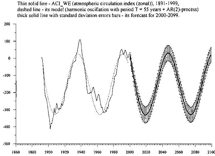 Figure 9.1 The future fluctuations of detrended Global temperature anomaly (top) and "zonal" form of Atmospheric Circulation Index (bottom).