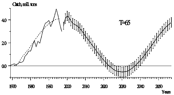 jack mackerel catch, 1969-1997, thick solid lines with standard deviations error