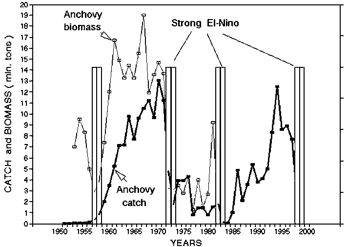 Total biomass and commercial catch of Peruvian anchoveta during its maximum production (outbursts) may reach 20 and 13 million tons, respectively. Stock fluctuations of Peruvian anchoveta are not as closely correlated with the dynamics of "meridional" atmospheric circulation as other "meridional-dependent" fish species (Atlantic and Pacific herring, and Atlantic cod). In addition, the population of Peruvian anchoveta undergoes catastrophic declines because of the strong El events (Mysak 1986). These events complicate forecasting of Peruvian anchoveta and requires special discussion.