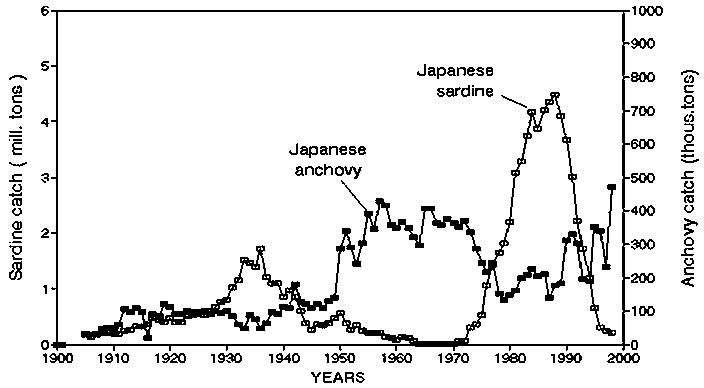 Similar data were obtained in the Californian upwelling where sardine and anchovy abundance series have exhibited a period of 50-70 years over the last 1700 years. As with the Peruvian data, both period and amplitude of these fluctuations are similar to the period and amplitude of the present century's directly observed fluctuations, although those occurring in the sediment record could only be the result of natural factors (Baumgartner et al.1992).