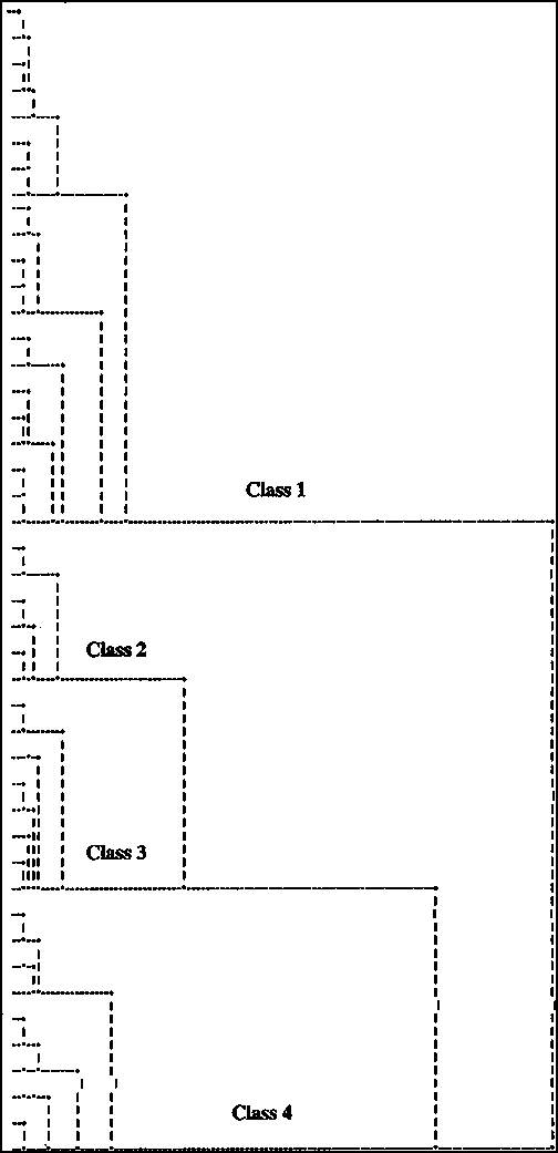The results obtained, following a hierarchical classification, are presented in the form of a tree illustrating the successive grouping of the elements under analysis, in classes which ultimately amalgamate to form a single unique group which represents the total population. The tree can be interpreted in a descending (from the "trunk" to the "leaves" of the tree) or ascending (from the "leaves" to the "trunk ") fashion. The problem lies in the definition of an appropriate cut in the tree to establish the number of classes relevant to the profile.